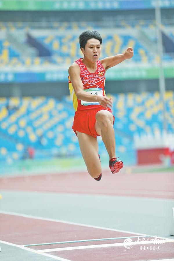10月25日,內(nèi)蒙古運動員趙強在跳遠比賽上奮力一跳。