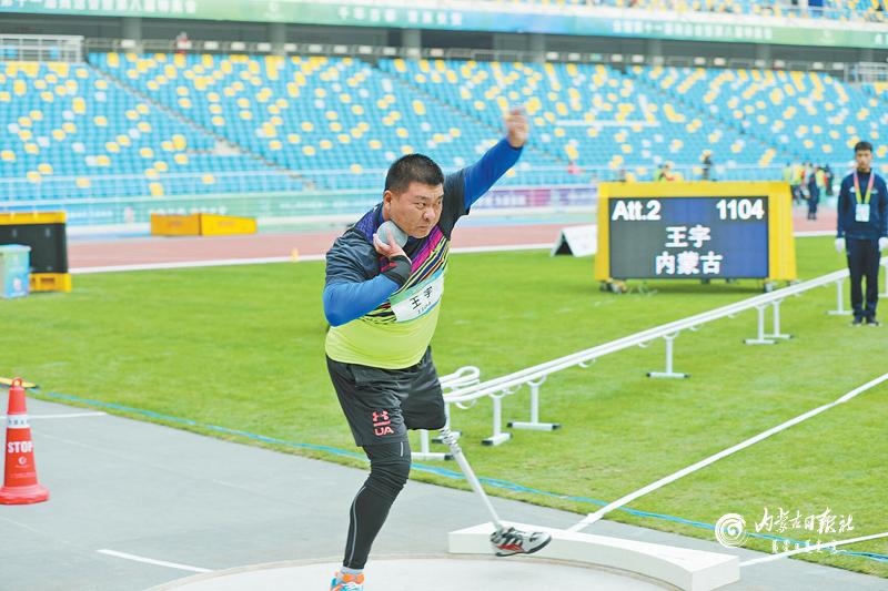 內(nèi)蒙古肢體殘疾運動員王宇在鉛球比賽上的投球瞬間。