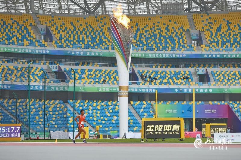 10 月23 日,男子t11 級10000米的賽場上,內(nèi)蒙古運動員孟可在沒有領(lǐng)跑員的不利條件下,依然堅持跑完了全程。