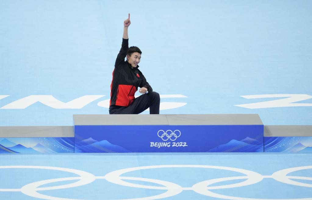 2月12日,冠軍中國選手高亭宇在獎(jiǎng)牌頒發(fā)儀式上一躍而上頒獎(jiǎng)臺(tái)。新華社記者程婷婷攝
