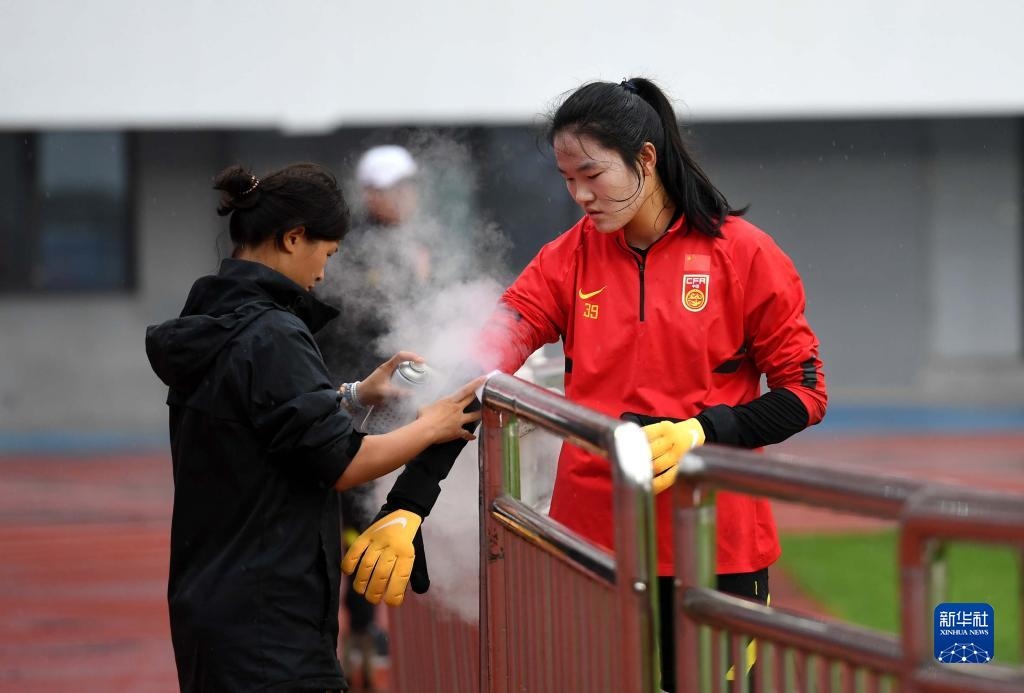 7月12日,守門員潘紅艷(右)在訓練中接受治療。新華社記者 李紫恒 攝