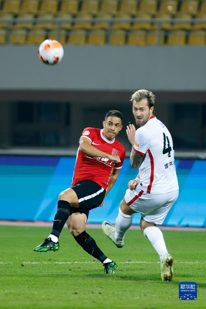 11月7日,長(zhǎng)春亞泰隊(duì)球員埃里克(左)在比賽中和成都蓉城隊(duì)球員周定洋拼搶。新華社記者 沈伯韓 攝