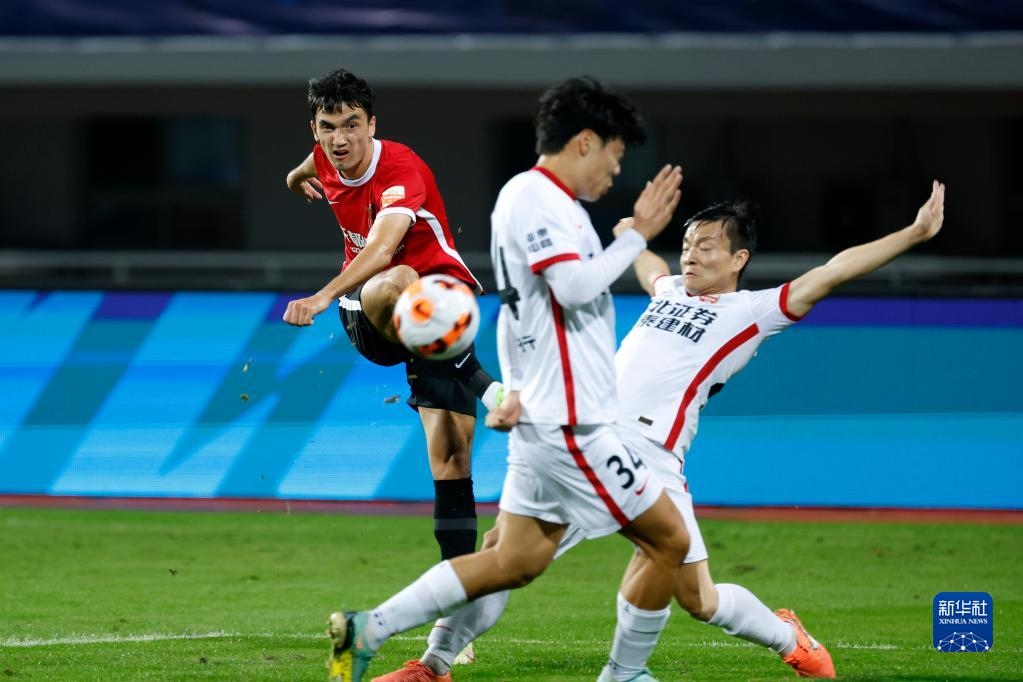 11月7日,成都蓉城隊(duì)球員木塔力甫·依明卡日(左)在比賽中射門。新華社記者 沈伯韓 攝