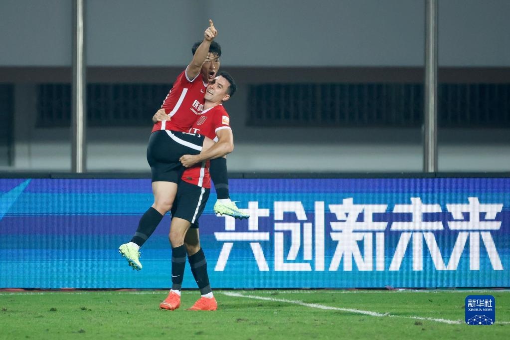 11月7日,成都蓉城隊(duì)球員金敃友(左)進(jìn)球后與隊(duì)友周定洋慶祝。新華社記者 沈伯韓 攝