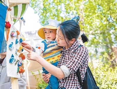 游客在集市攤位上挑選特色文創(chuàng)產(chǎn)品。