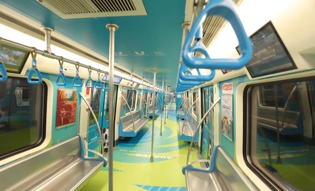 整體車廂打造創(chuàng)新植入了色彩明快、充滿青春氣息的“移動(dòng)運(yùn)動(dòng)場(chǎng)”概念,立面畫面則結(jié)合青春動(dòng)感的大學(xué)生形象,并選用田徑、網(wǎng)球、籃球、體操等運(yùn)動(dòng)的代表性動(dòng)作為設(shè)計(jì)元素,全面凸顯成都大運(yùn)會(huì)賽事核心主題。