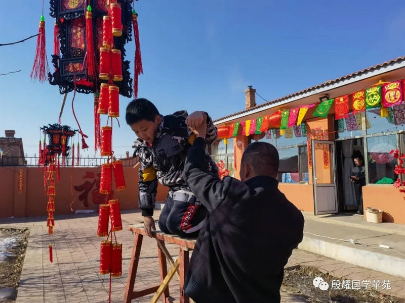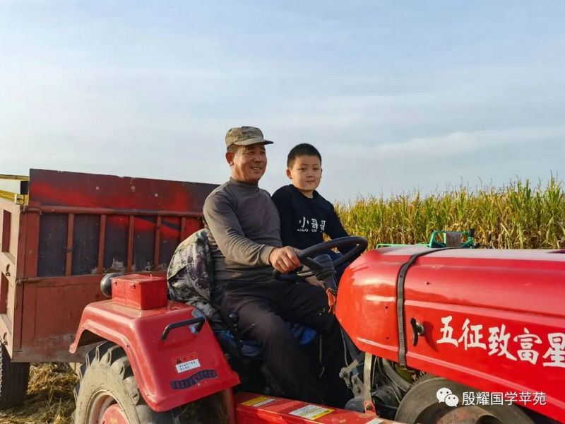 父親讓曈曈接地氣的愿望實(shí)現(xiàn)了,長(zhǎng)得越來(lái)越壯實(shí)的曈曈真是打心眼喜歡上了農(nóng)村,喜歡看叔叔大爺們是如何勞動(dòng)的。春天澆地的時(shí)候,他跟上我的發(fā)小利利到地里去,手里拿上一張鐵鍬學(xué)著去攏堰堤;秋收的時(shí)候他爬上了丁補(bǔ)元駕駛的收割機(jī),感受農(nóng)民們收割玉米的喜悅;接羔的時(shí)候,他又鉆進(jìn)利軍家的羊群里,抱著出生沒(méi)有幾天的小羊羔,給小羊羔喂牛奶……春節(jié)前的一兩天是他最忙的時(shí)候:一會(huì)跟上大爹貼春聯(lián),一會(huì)跟上茹義大爺掛紅燈,忙得不亦樂(lè)乎。前一段時(shí)間回村里他又要跟上利軍大爺出村放羊去,又要跟上茹義大爺去種玉米,在城里他是見(jiàn)識(shí)不到這些的。