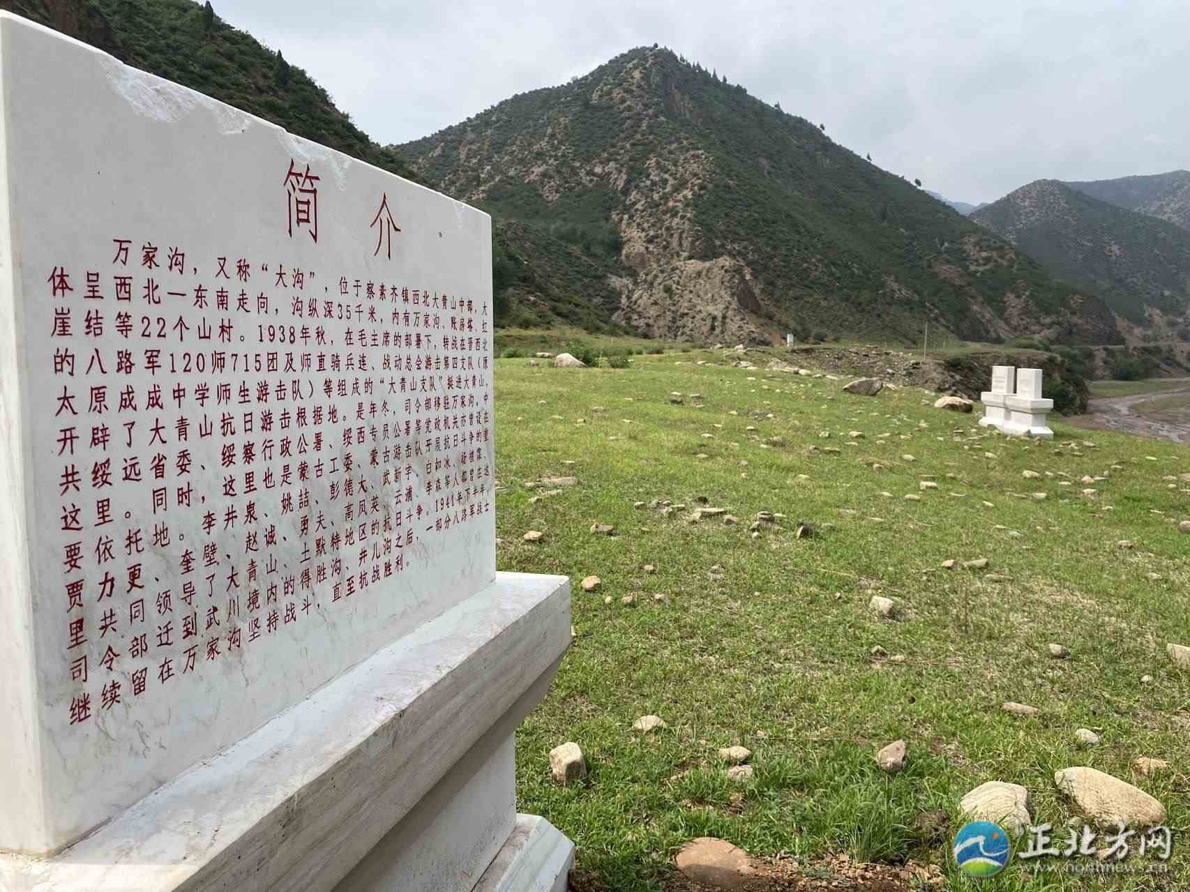 入溝不久,在綠草如茵的山坡上,就可以眺望到遠處已經(jīng)廢棄的民房,有幾十年前的老房子,也有建筑時間不長的,眼前的一切讓人恍惚,仿佛剛剛還在上演煙火氣息的鄉(xiāng)村生活。在這里矗立著寫有“萬家溝革命遺址”的漢白玉紀念碑,這是土左旗文物保護中心副主任高鷹和同事們半年前安放的。從這里,萬家溝革命遺址的探訪正式開始。
