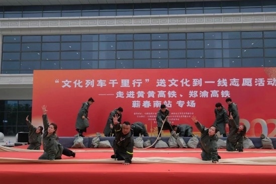 中國鐵路文聯(lián)的表演藝術(shù)家和武漢局集團(tuán)公司的文藝志愿者橫跨1000多公里,先后在湖北蘄春、興山、襄陽等地,以及兩趟高鐵列車上舉辦了五場文藝志愿演出。在飛馳的G2531次和G3463次復(fù)興號(hào)動(dòng)車組列車上,中國鐵路文工團(tuán)女高音歌唱家牛悅敏用甜美的聲音動(dòng)情地演唱了歌曲《坐著高鐵看中國》;中國曲藝最高獎(jiǎng)獲得者徐寧帶來了詼諧幽默的湖北大鼓《學(xué)京劇》;湖北省青年川劇演員胡啟文表演了川劇《變臉》。節(jié)目內(nèi)容豐富多彩,引人入勝。