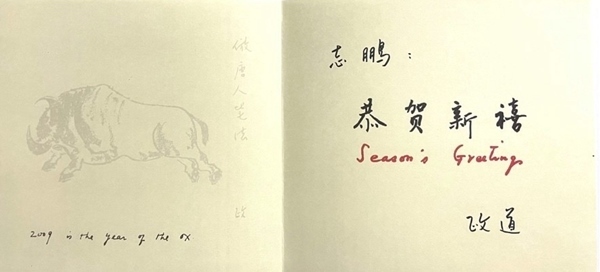 2009年為農(nóng)歷已丑年,俗稱牛年。李政道在賀年卡上畫了一頭健壯的牛。這頭牛騰起四蹄,犄角對著前方,勇猛無比。淡淡的筆墨,精準(zhǔn)的線條,黑白的布局,一頭開山牛躍然紙上。牛尾的右上部,他用鉛筆輕輕寫上了:“仿唐人筆法”。然后簽上了自己名字中的“政”字。