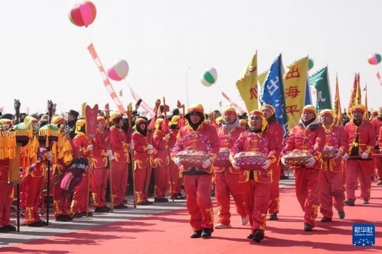 當(dāng)日,遼寧省盤錦市舉辦盤錦首屆漁雁文化節(jié)暨第六屆二界溝開海節(jié)?;顒?dòng)中漁家祭祀、非遺秧歌、舞獅等演出再現(xiàn)當(dāng)?shù)貪O雁文化,漁民也通過這樣的形式表達(dá)盼望新一年漁業(yè)豐收的美好愿望。