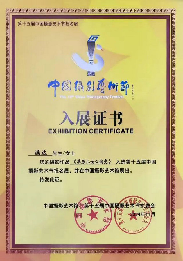 近日,內蒙古畫報社記者滿達攝影作品《草原兒女心向黨》入選第十五屆中國攝影藝術節(jié)報名展。