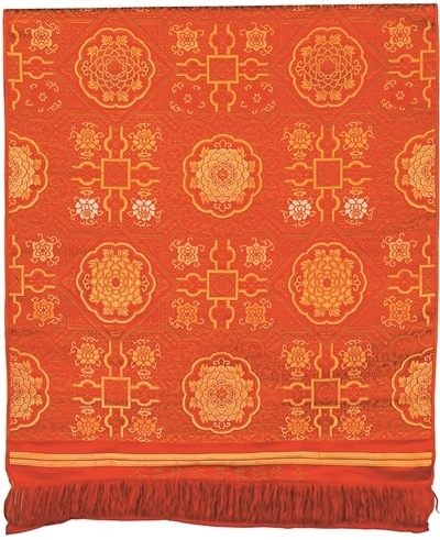 宋錦主產(chǎn)地為蘇州,與云錦、蜀錦并稱為中國(guó)古代三大名錦。宋錦采用經(jīng)線緯線聯(lián)合顯花的組織結(jié)構(gòu)和彩拋換色工藝,風(fēng)格古樸典雅,在古代多用于書(shū)畫(huà)裝裱,有著獨(dú)特的藝術(shù)魅力。清代紅地如意牡丹紋天華錦為宮廷用宋式錦,紅緞地上以彩色絲線和金線作緯顯花,圖案基本骨架為典型的宋錦紋樣——“米”字狀八達(dá)暈式樣,飾有牡丹、蓮花、如意紋等,寓意富貴安康、吉祥如意。