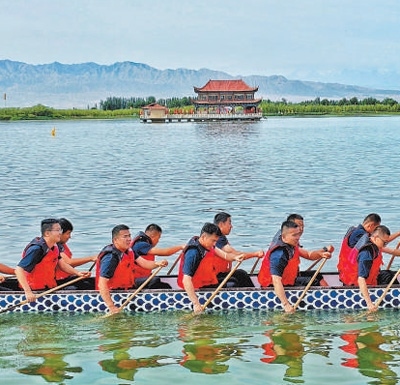 龍舟隊在甘肅高臺大湖灣水域競渡。