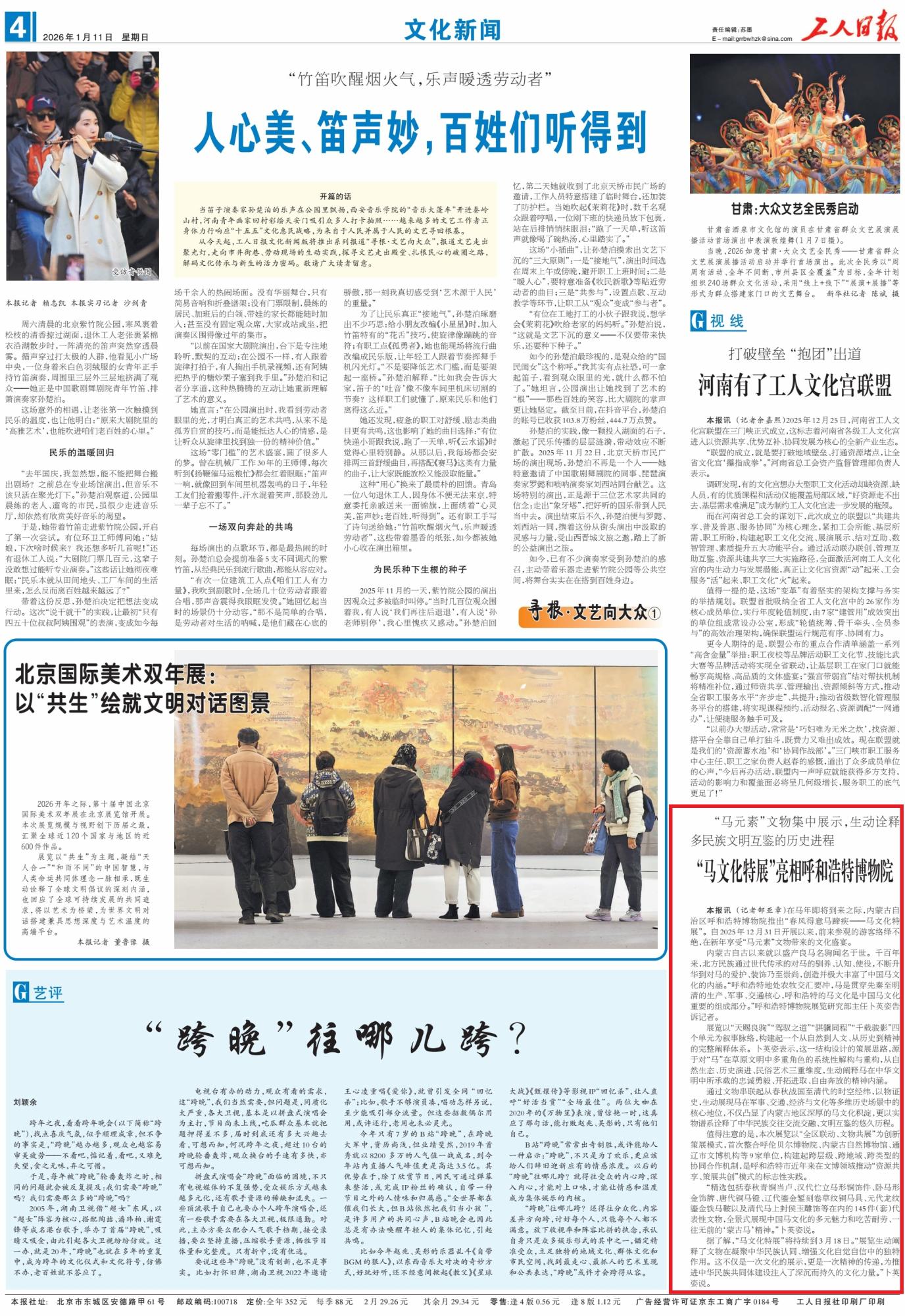 2026年1月11日,《工人日報》第4版刊發(fā)了《“馬文化特展”亮相呼和浩特博物院》的文章,報道了馬年即將到來之際,呼和浩特博物院于2025年12月31日推出“春風得意馬蹄疾——馬文化特展”,吸引眾多游客前來領略馬元素文物的文化魅力,展覽將持續(xù)至3月18日。