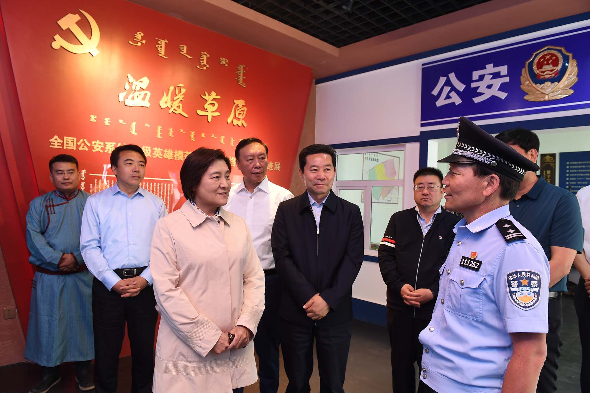 烏拉特后旗公安局潮格溫都爾鎮(zhèn)派出所民警寶音德力格爾被授予“全國公安系統(tǒng)一級英雄模范”榮譽稱號。布小林走進寶音德力格爾事跡館參觀,與寶音德力格爾親切交談,對他舍小家顧大家、為人民群眾無私奉獻的精神給予充分肯定。