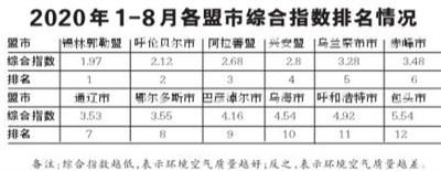 2020年1-8月,全區(qū)環(huán)境空氣質量達標天數(shù)比例平均為88.6%。12個盟市達標天數(shù)比例由高至低依次為:呼倫貝爾市(100.0%)、錫林郭勒盟(98.8%)、興安盟(95.9%)、赤峰市(93.4%)、烏蘭察布市(93.4%)、阿拉善盟(92.6%)、鄂爾多斯市(88.5%)、通遼市(88.1%)、巴彥淖爾市(81.0%)、烏海市(79.1%)、包頭市(76.2%)和呼和浩特市(76.2%)。