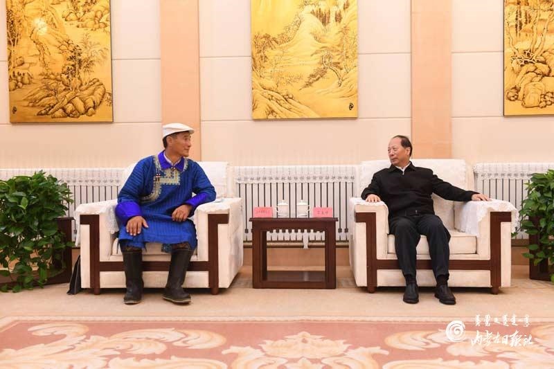 7月29日,自治區(qū)黨委書記、人大常委會(huì)主任石泰峰在主持召開草原生態(tài)保護(hù)補(bǔ)助獎(jiǎng)勵(lì)政策實(shí)施情況專題匯報(bào)會(huì)前,會(huì)見(jiàn)自治區(qū)人大代表浩畢斯嘎拉圖。內(nèi)蒙古日?qǐng)?bào)記者袁永紅攝