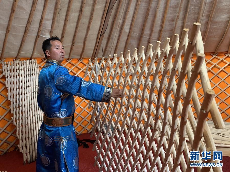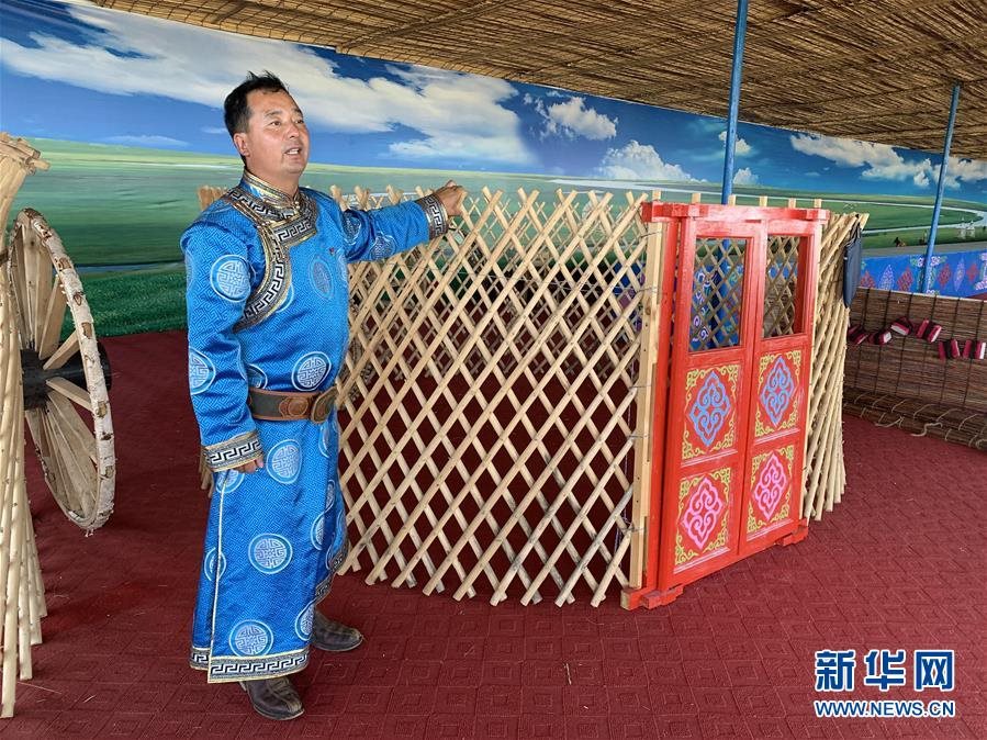 7月17日,布仁巴雅爾在展示編織完成的蒙古包圍壁。新華社記者 王靖 攝