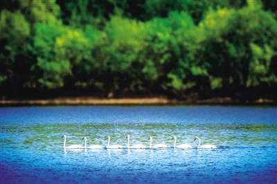 內(nèi)蒙古大興安嶺保存完整的生態(tài)系統(tǒng),為保護(hù)生物多樣性提供了基礎(chǔ)。圖為一群大天鵝遷徙途中落腳大興安嶺天然湖泊。