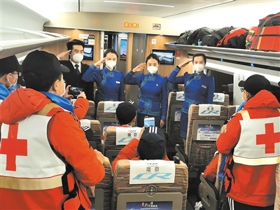 作為連通全國的運輸動脈,在完成常規(guī)運輸任務的基礎上,高鐵列車還承擔起了運送醫(yī)務人員、醫(yī)療用品和保障物資的特別任務。內蒙古援鄂醫(yī)療隊員兩批次乘坐G2438次列車從北京中轉赴武漢;五批次乘坐“草原動車”由鄂爾多斯回到呼和浩特。“送英雄出征,接英雄回家”,七次運輸任務,高鐵車隊以最高禮遇和精心的服務,贏得醫(yī)療隊員們的紛紛好評?!爸x謝你們,出發(fā)時為我們送行,歸來時為我們唱起凱旋之歌?!贬t(yī)療隊隊員李紅娟緊緊握住列車長張雨的手說。
