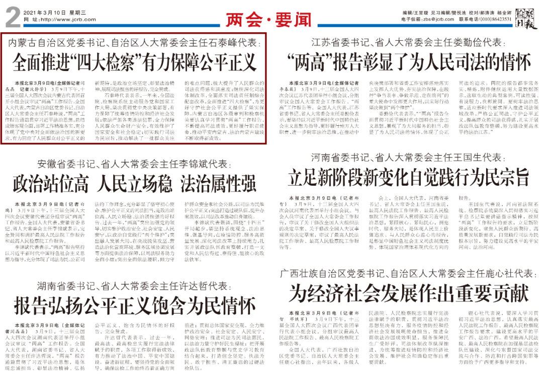 3月10日《檢察日?qǐng)?bào)》第2版——內(nèi)蒙古自治區(qū)黨委書記、自治區(qū)人大常委會(huì)主任石泰峰代表:全面推進(jìn)“四大檢察”有力保障公平正義