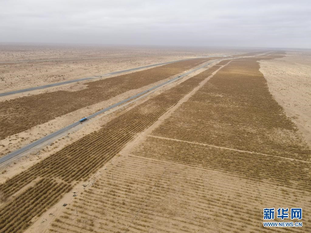 這是新疆且末縣國(guó)道旁種植的生態(tài)梭梭林(3月31日攝,無(wú)人機(jī)照片)。新華社記者 高晗 攝