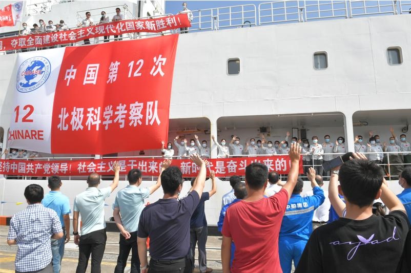 人們在上海國內(nèi)基地碼頭歡迎“雪龍2”號科考破冰船返航。自然資源部供圖