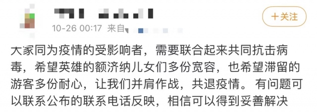 在社交媒體上,一名王姓女士通過(guò)短視頻呈現(xiàn)了一家人滯留額濟(jì)納的境況,在視頻中,她為同樣滯留在此的游客鼓勁:“如果你此時(shí)正在阿拉善,愿你如胡楊般堅(jiān)強(qiáng),積極應(yīng)對(duì)疫情?!边@條短視頻發(fā)出數(shù)小時(shí),就吸引了20余萬(wàn)瀏覽量?! ?/p>