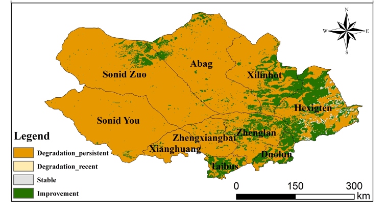 論文通訊作者王鋒研究員進(jìn)一步解釋說,該評(píng)估框架以16年為評(píng)價(jià)時(shí)段,間隔5年開展生態(tài)系統(tǒng)生態(tài)質(zhì)量評(píng)價(jià)。將2000-2015年的生態(tài)質(zhì)量作為參考基線,2005-2020年的生態(tài)質(zhì)量作為現(xiàn)狀,通過生態(tài)系統(tǒng)現(xiàn)狀質(zhì)量與參考基線質(zhì)量的比較開展評(píng)價(jià)。使用歸一化植被指數(shù)、土壤有機(jī)碳和沙塵暴三個(gè)指標(biāo)分別代表植被、土壤和大氣質(zhì)量,每個(gè)指標(biāo)變化包括提高、穩(wěn)定和退化3個(gè)水平。三個(gè)指標(biāo)通過邏輯運(yùn)算而非權(quán)重計(jì)算獲得生態(tài)系統(tǒng)質(zhì)量指標(biāo)變化,兼顧了不同響應(yīng)速率指標(biāo)變化對(duì)生態(tài)系統(tǒng)質(zhì)量的影響。若三個(gè)指標(biāo)中有一項(xiàng)退化,生態(tài)質(zhì)量指標(biāo)即為退化。
