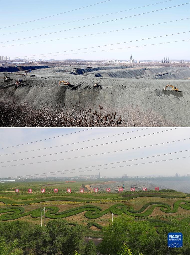 這是一張拼版照片:上圖為遼寧省撫順市西露天礦部分區(qū)域生態(tài)恢復(fù)前的場景(2019年3月6日攝,資料照片);下圖為2022年6月2日拍攝的遼寧省撫順市西露天礦部分區(qū)域生態(tài)恢復(fù)后的場景(新華社記者楊青攝,無人機(jī)照片)。新華社發(fā)