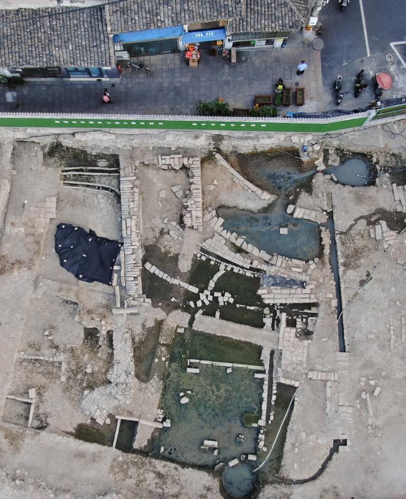 俯瞰朔門古港遺址發(fā)掘出的甕城遺址(10月10日攝,無(wú)人機(jī)照片)。新華社記者翁忻旸 攝