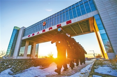 內(nèi)蒙古出入境邊防檢查總站二連出入境邊防檢查站民警在二連浩特國(guó)門執(zhí)勤巡邏,守護(hù)國(guó)門安全。郭鵬杰攝