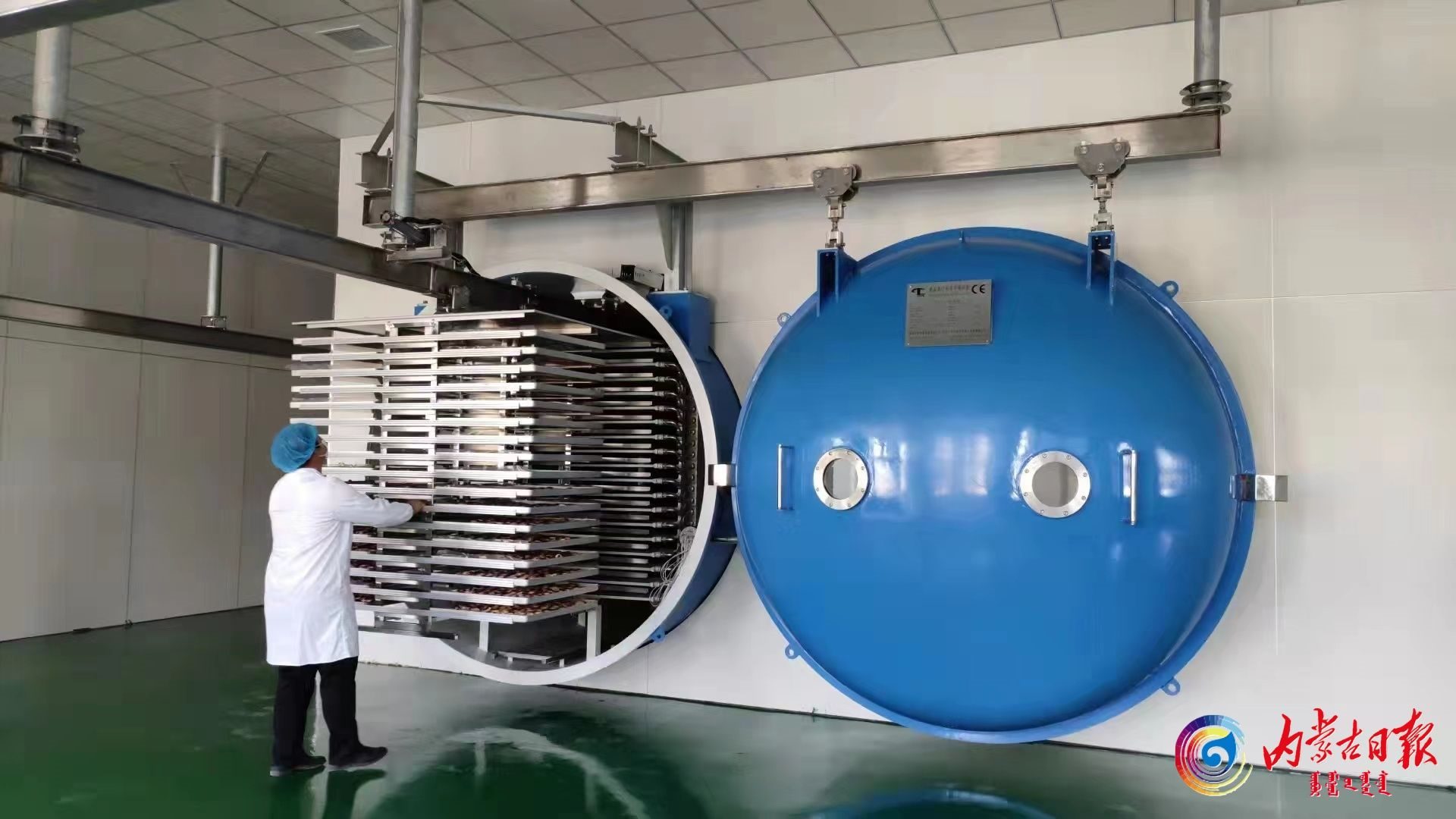 蒙果鮮食品有限公司員工將鮮果片裝入真空干燥倉進(jìn)行凍干處理。