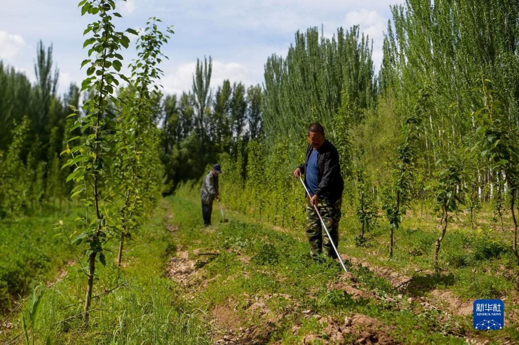 6月5日,臨河區(qū)國營新華林場(chǎng)工人在管護(hù)林木。新華社記者 李志鵬 攝