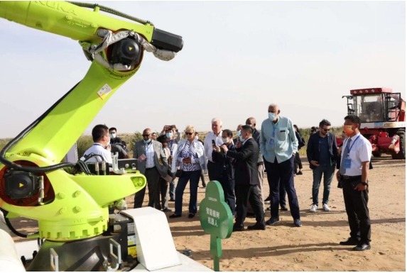 第八屆庫布其國際沙漠論壇上,外國嘉賓觀摩億利集團(tuán)機(jī)器人植樹。