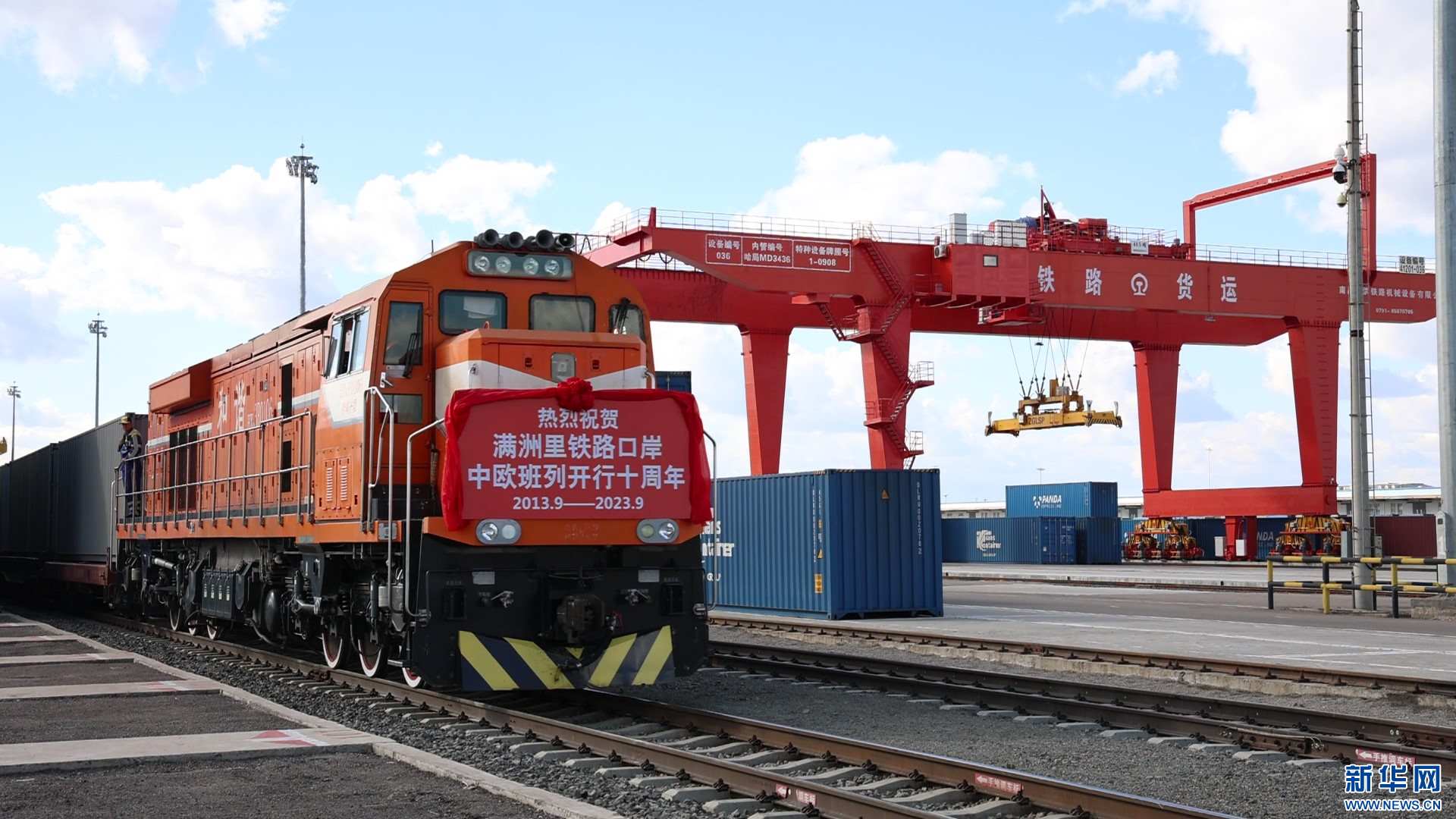 滿洲里鐵路口岸中歐班列開(kāi)行十周年等待發(fā)車。新華網(wǎng)發(fā) (李新軍 攝)