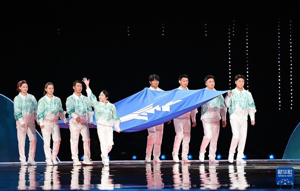 ??2月17日,中華人民共和國第十四屆冬季運動會會旗在開幕式上入場。新華社記者 黃偉 攝