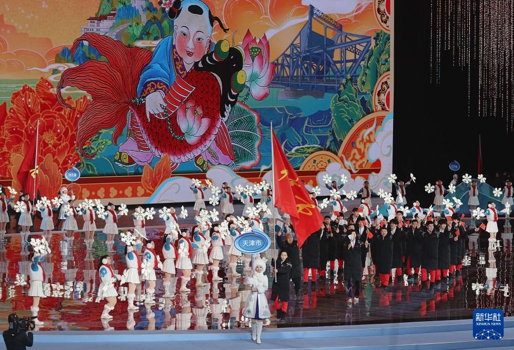 ??2月17日,天津市體育代表團在開幕式上入場。新華社記者 李博 攝