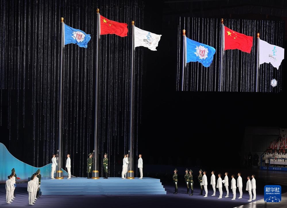 ??2月17日,中華人民共和國第十四屆冬季運動會會旗在開幕式上入場。新華社記者 楊晨光 攝