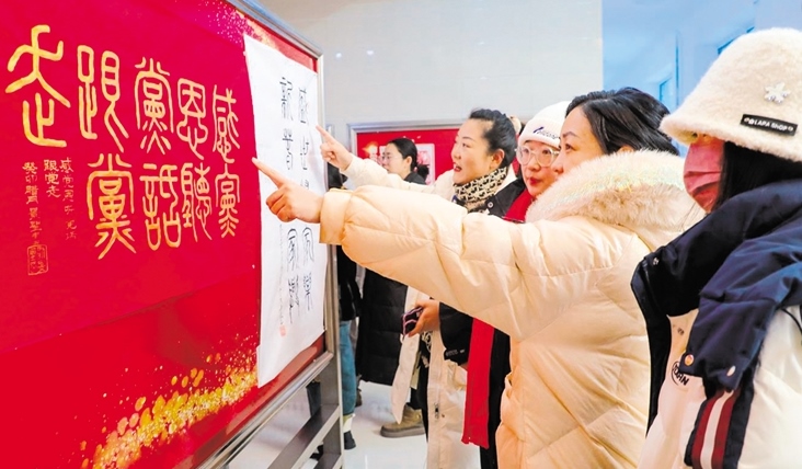 各類(lèi)參展作品掛在以紅色為底的展板上,新年的氛圍感瞬間拉滿?!芭e辦這次活動(dòng)特別有意義,真的很喜歡這種文化氛圍?!眱?nèi)蒙古自治區(qū)第八屆道德模范獲得者鄭洪山邊看邊說(shuō)。