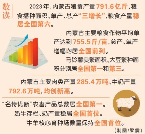 五谷者,萬民之命,國(guó)之重寶。2023年,內(nèi)蒙古以糧食產(chǎn)量791.6億斤迎來了第二十個(gè)豐收年。糧食播種面積、單產(chǎn)、總產(chǎn)“三增長(zhǎng)”,糧食產(chǎn)量穩(wěn)居全國(guó)第六。全區(qū)主要肉類產(chǎn)量285.4萬噸、牛奶產(chǎn)量792.6萬噸,均創(chuàng)新高。“名特優(yōu)新”農(nóng)畜產(chǎn)品總數(shù)居全國(guó)第一,“內(nèi)蒙古味道”香飄萬里。