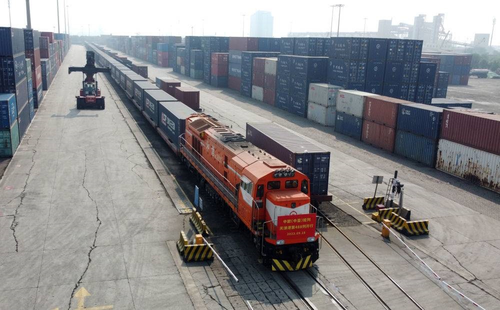 2023年9月18日,一列發(fā)往蒙古國烏蘭巴托的中歐(中亞)班列駛出天津港物捷三堆場(無人機照片)。