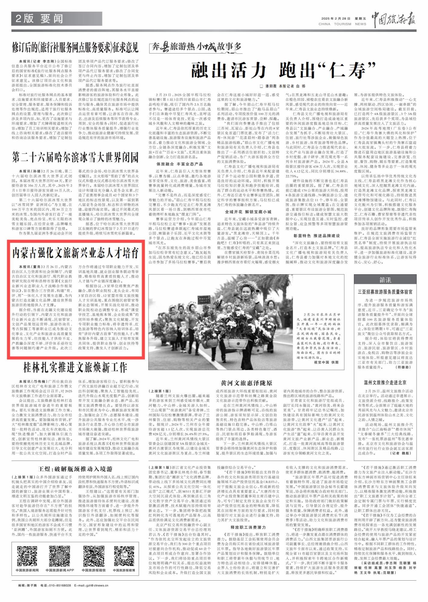 2015年2月28日,《中國旅游報》第2版刊發(fā)題為《內(nèi)蒙古強化文旅新興業(yè)態(tài)人才培育》的消息,報道了內(nèi)蒙古整合三方資源,構(gòu)建“育、評、用”一體化人才發(fā)展生態(tài)圈,為內(nèi)蒙古打造北疆文化品牌、建設(shè)世界級旅游目的地提供人才支撐。