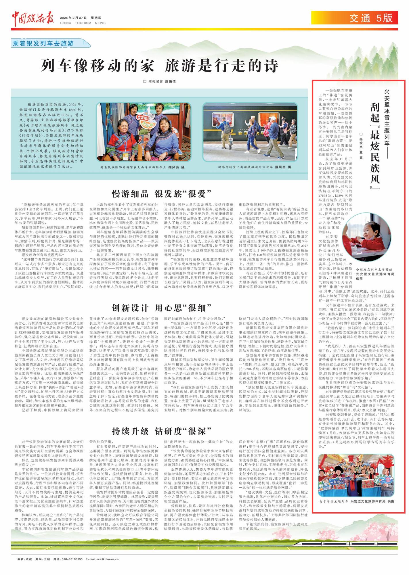 2025年2月27日,《中國旅游報》第5版刊發(fā)題為《興安盟冰雪主題列車——刮起“最炫民族風”》的文章,報道了一列列由內(nèi)蒙古興安盟烏蘭浩特往返于阿爾山百年老車站的“歌游內(nèi)蒙古 夢幻阿爾山”冰雪主題列車成為人們爭相體驗的旅游產(chǎn)品。