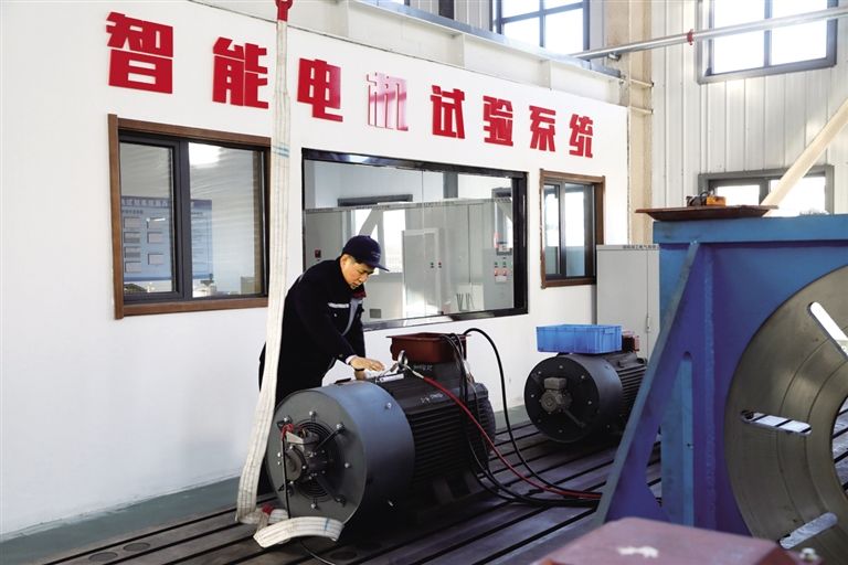 內(nèi)蒙古優(yōu)普森電氣有限公司生產(chǎn)車(chē)間內(nèi)一臺(tái)永磁電機(jī)正在進(jìn)行出廠(chǎng)前試驗(yàn)。 記者 劉向平 攝