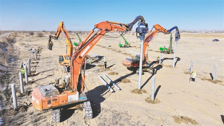 引孔機(jī)、打樁機(jī)轟鳴聲不絕于耳,打樁機(jī)將一根根水泥樁“釘”入地面中……連日來(lái),巴彥淖爾市臨河區(qū)新華林場(chǎng)防沙治沙和光伏一體化項(xiàng)目施工現(xiàn)場(chǎng)多臺(tái)作業(yè)車(chē)輛同時(shí)進(jìn)行樁基作業(yè),現(xiàn)場(chǎng)還不時(shí)有工作人員對(duì)打樁等基礎(chǔ)工作進(jìn)行抽檢抽查,確保施工質(zhì)量。