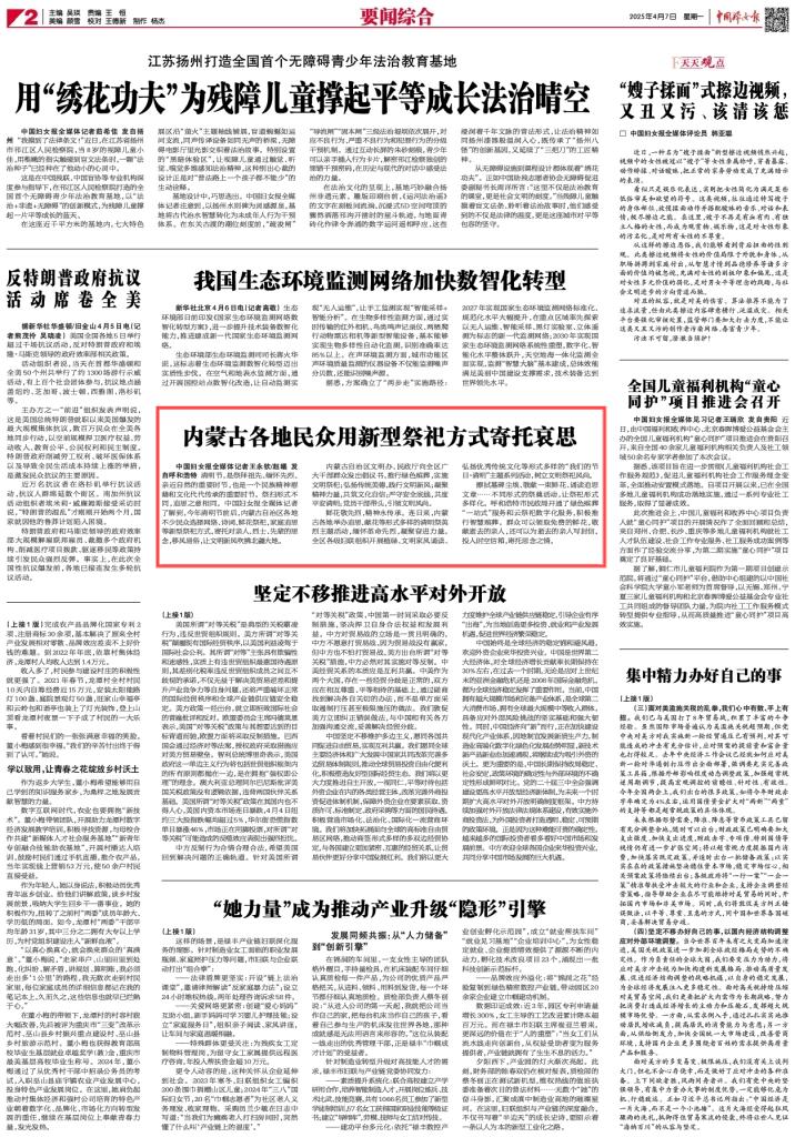 2025年4月7日,《中國婦女報(bào)》第2版刊發(fā)題為《內(nèi)蒙古各地民眾用新型祭祀方式寄托哀思》的稿件,報(bào)道了今年清明節(jié)前后,內(nèi)蒙古自治區(qū)各地不少民眾選擇網(wǎng)絡(luò)、詩詞、鮮花祭祀,家庭追思等新型祭祀方式,寄托對親人、烈士、先輩的思念,移風(fēng)易俗,文明新風(fēng)吹拂北疆大地。
