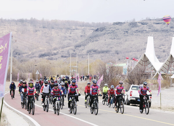 5月19日,在內(nèi)蒙古自治區(qū)興安盟阿爾山市奧倫布坎景區(qū),游客們參加騎行活動。