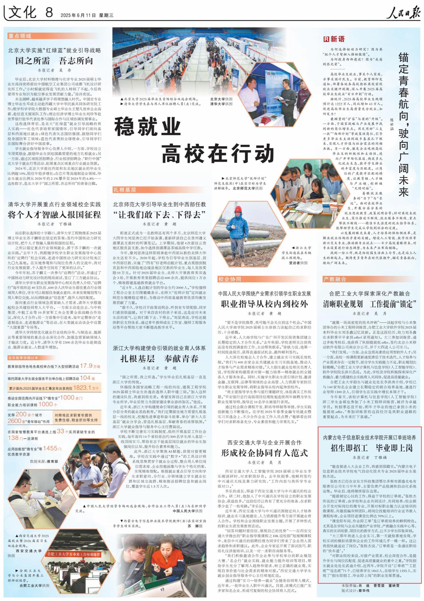2025年6月11日,《人民日?qǐng)?bào)》第8版刊發(fā)題為《內(nèi)蒙古電子信息職業(yè)技術(shù)學(xué)院開(kāi)展訂單班培養(yǎng) 招生即招工 畢業(yè)即上崗》的文章,報(bào)道了內(nèi)蒙古電子信息職業(yè)技術(shù)學(xué)院開(kāi)設(shè)“訂單班”“工匠班”“冠名班”,實(shí)現(xiàn)了“招生即招工、畢業(yè)即上崗”的職業(yè)發(fā)展貫通。